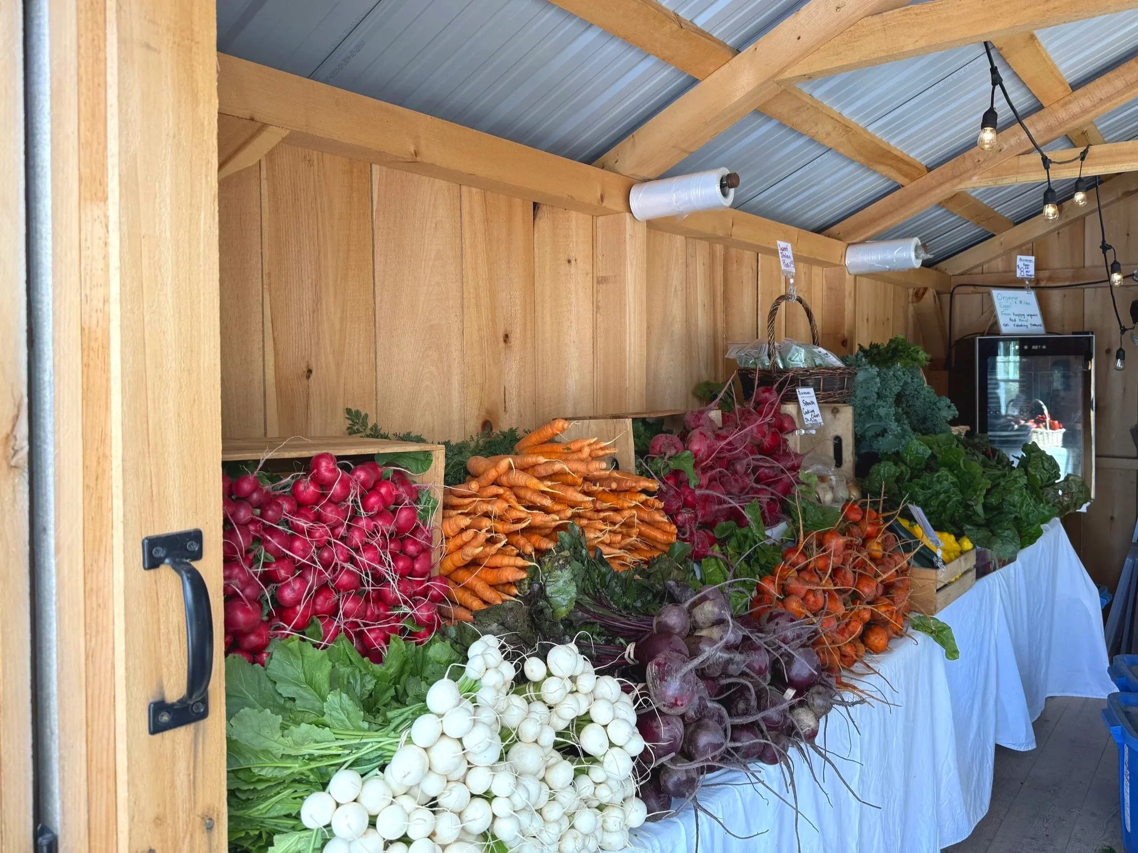 Browse the display cooler and produce tables, choose what you’d like, and pay by cash or e-transfer.